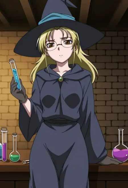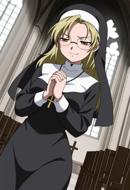 Mizuki Komiyama, blonde hair, glasses, brown eyes,
