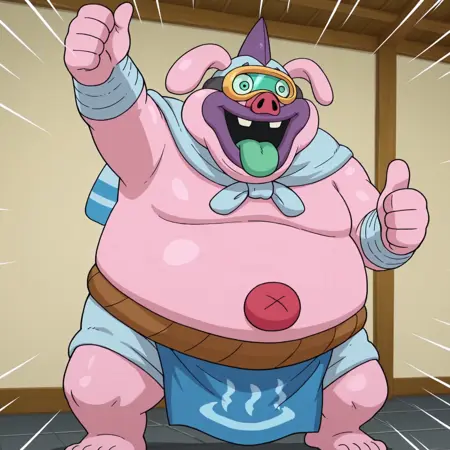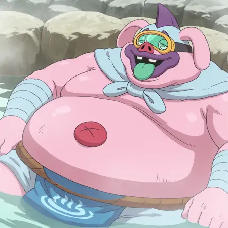 标签: 传统妖怪、猪、粉红色皮肤、绿色眼睛、兔耳朵、毛茸茸的男性、单角、紫色角、紫色嘴唇、游泳镜、斗篷、丁字裤、腕带、短裤、蓝色面罩、吐舌头、牙齿、胖子、超重,