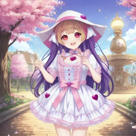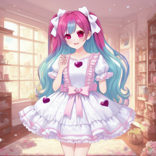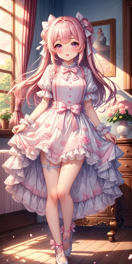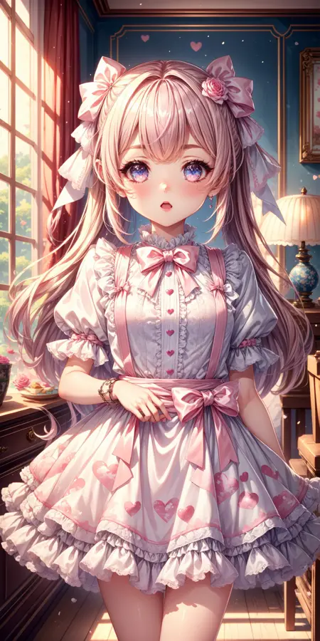 white brocade rose print short lace-trimmed shiny satin puffy dress, white brocade rose_print, white (brocade rose print on lace-trimmed shiny satin puffy dress), hot pink (sequin heart chest_ornament), white lace-trimmed puffy short sleeves, light pink (lace suspender_straps), light pink shiny satin waist ribbon, white brocade rose print short attached lace-trimmed layered dress_skirt, (hot pink sequin hearts attached to short attached dress_skirt), white ruffles, white_frills, light pink lace, light pink ornate lace trim, bow, light pink bow