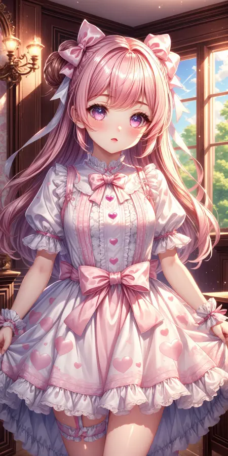 White Brocade Rose Print Puffy Satin Dress w/ Pink Sequined Hearts