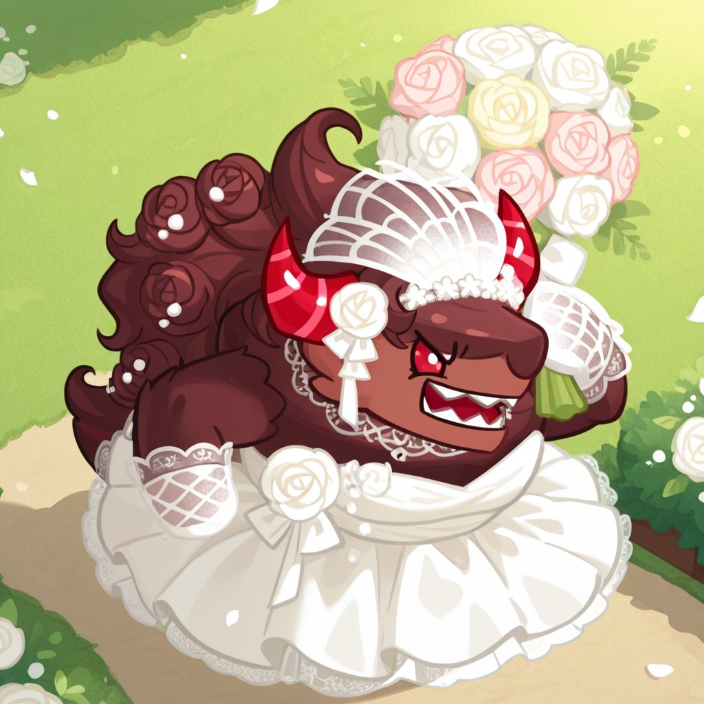 标签(婚礼): 长发,头发中夹着玫瑰,((婚礼Schwarzwalder)),白色发饰,男扮女装,婚纱,白色礼服,面纱,新娘面纱,白手套,毛茸茸的雄性,犬类,食物生物,狼人,红眼白,双色毛发,无手指,无脚趾,无瞳孔,棕色毛发,棕色头发,长发,红角,条纹角,尖牙,白玫瑰,(+手持花束)