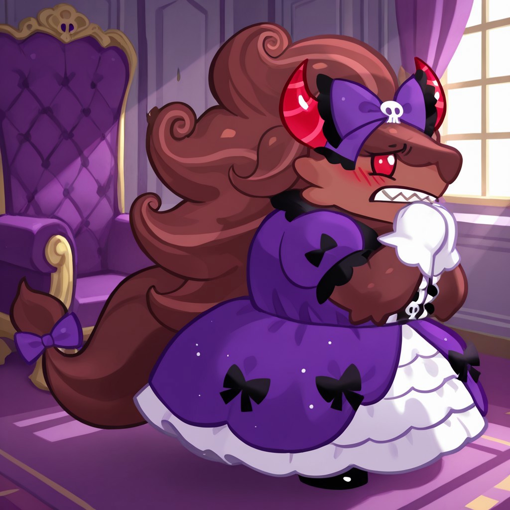 标签(公主): 公主Schwarzwalder,公主装,荷叶边连衣裙,头骨发饰,蝴蝶结,男扮女装,长裙,公主裙,紫色蝴蝶结,白手套,蓬松短袖,紫色连衣裙,公主,毛茸茸的雄性,犬类,食物生物,狼人,红眼白,无瞳孔,双色毛发,无手指,无脚趾,棕色毛发,棕色头发,条纹角,红角,尖牙,尾巴,棕色头发,大卷发,黑色鞋履,荷叶边连衣裙,头骨发饰,卷发,尖牙(+手持锤子,公主锤子)