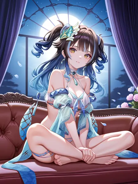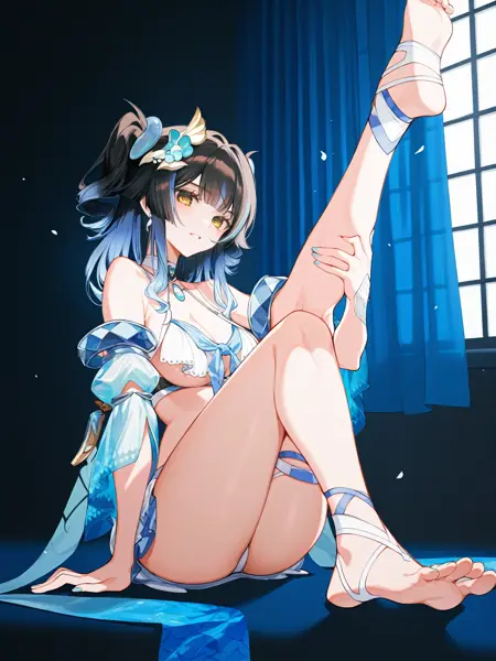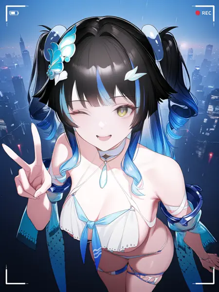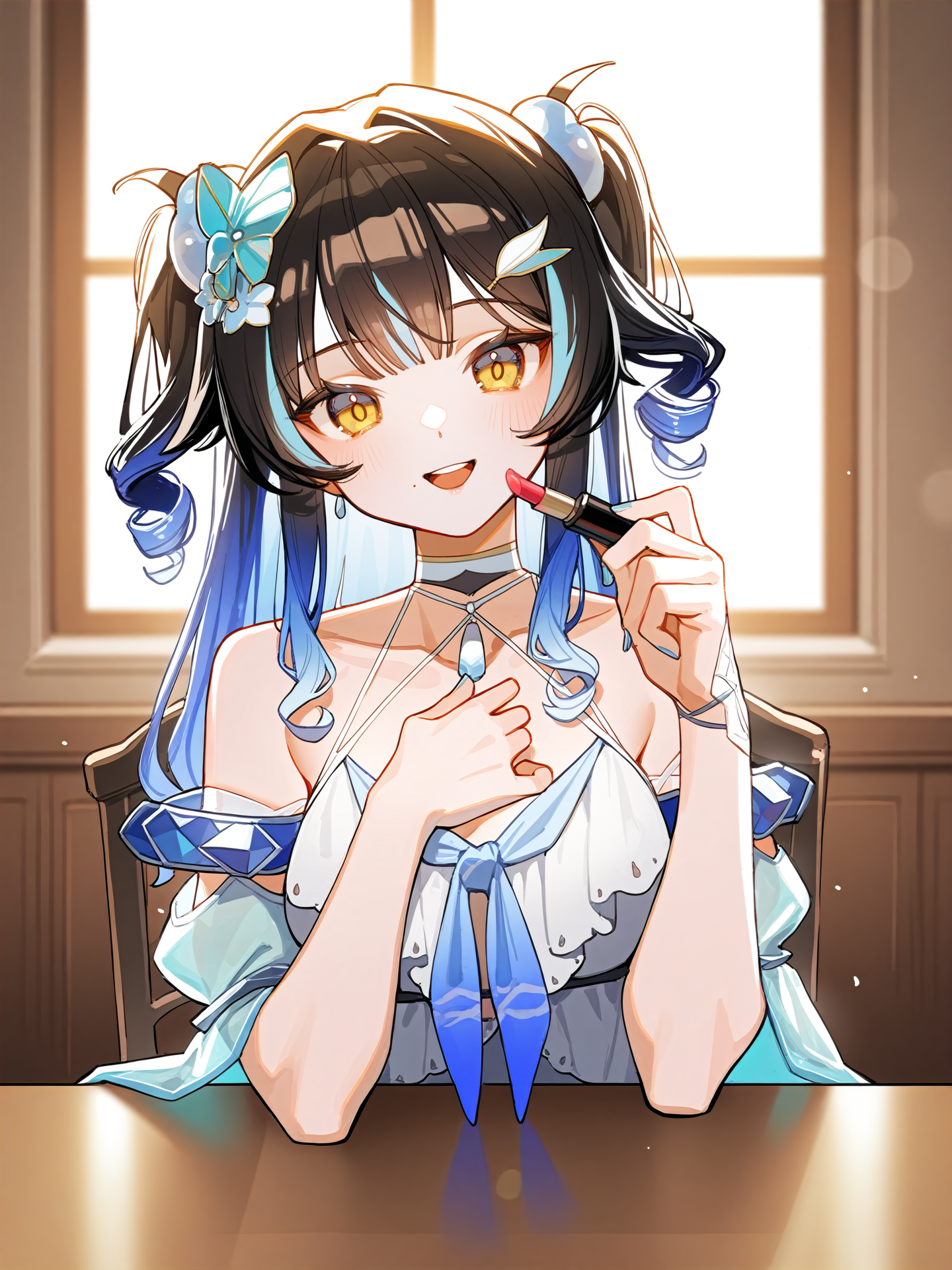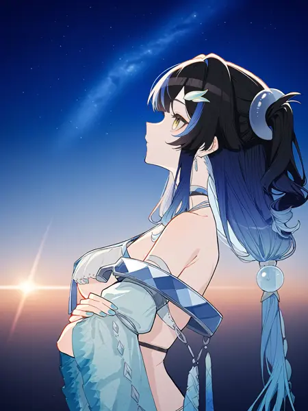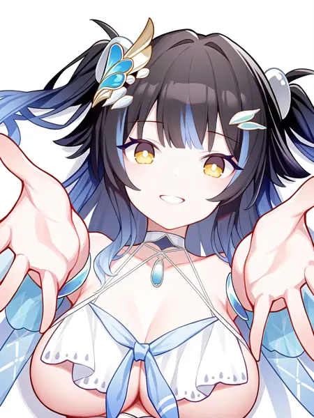 提示词:Siris, Siris-Freefin_(Azure Drift), yellow eyes, black hair, blue hair, multicolored hair, twintails, hair ornament, hairclip,