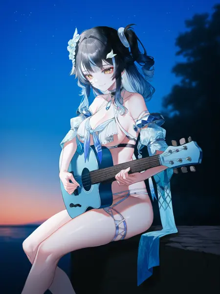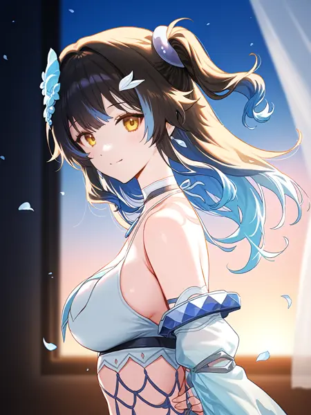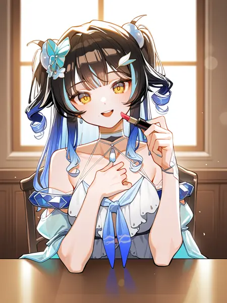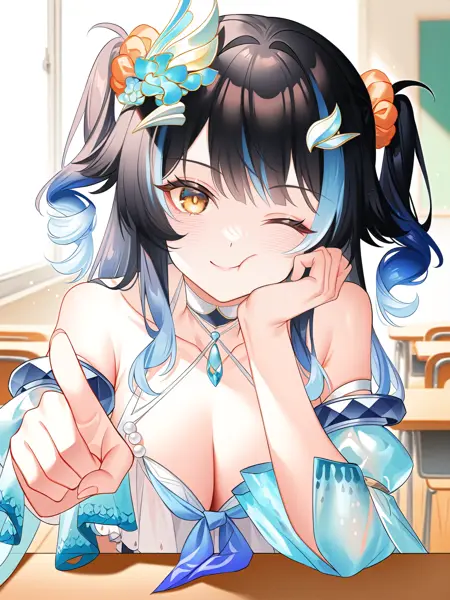 提示词:Siris, Siris-Freefin_(Azure Drift), yellow eyes, black hair, blue hair, multicolored hair, twintails, hair ornament, hairclip,