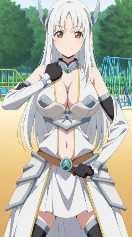 thighhighs, gloves, dress, navel, cleavage, bare shoulders, elbow gloves, belt, armor,