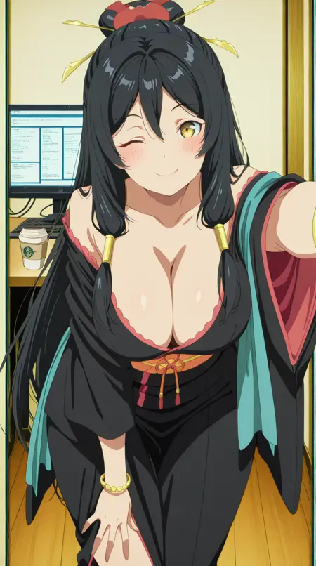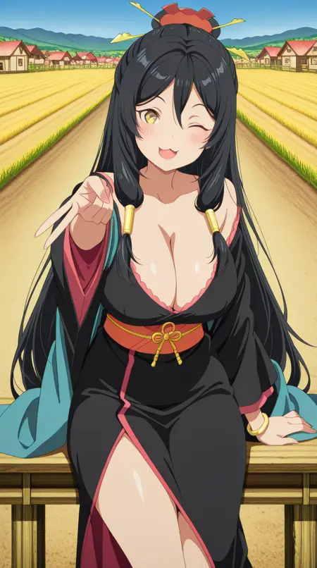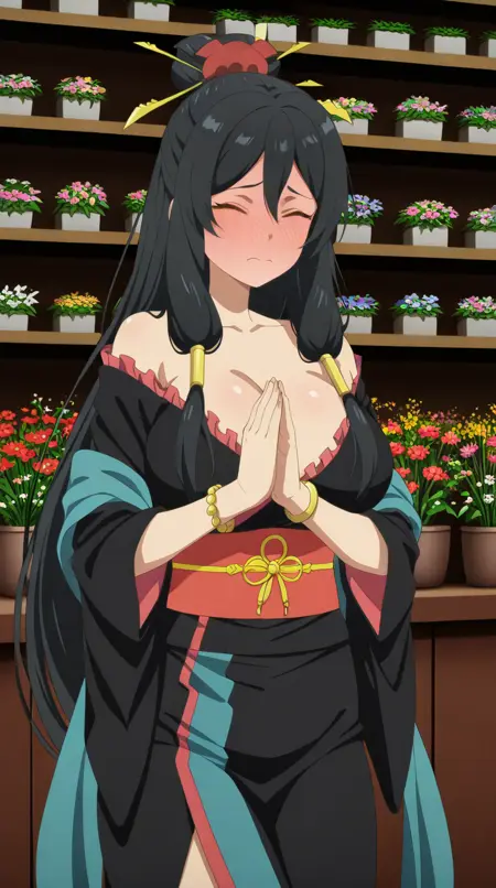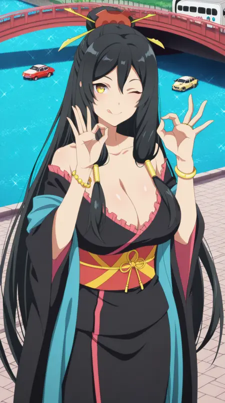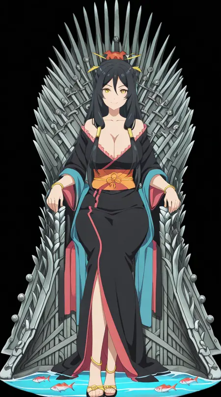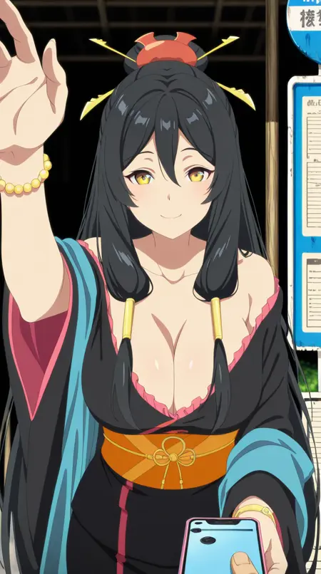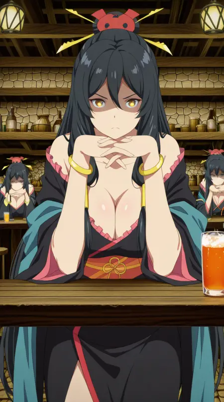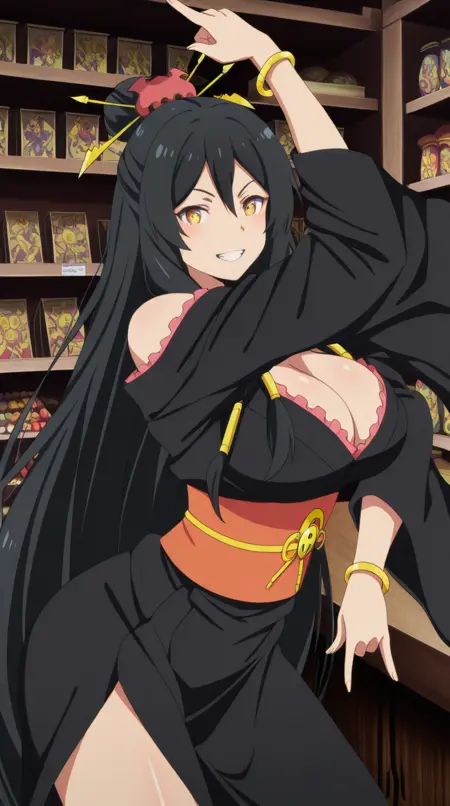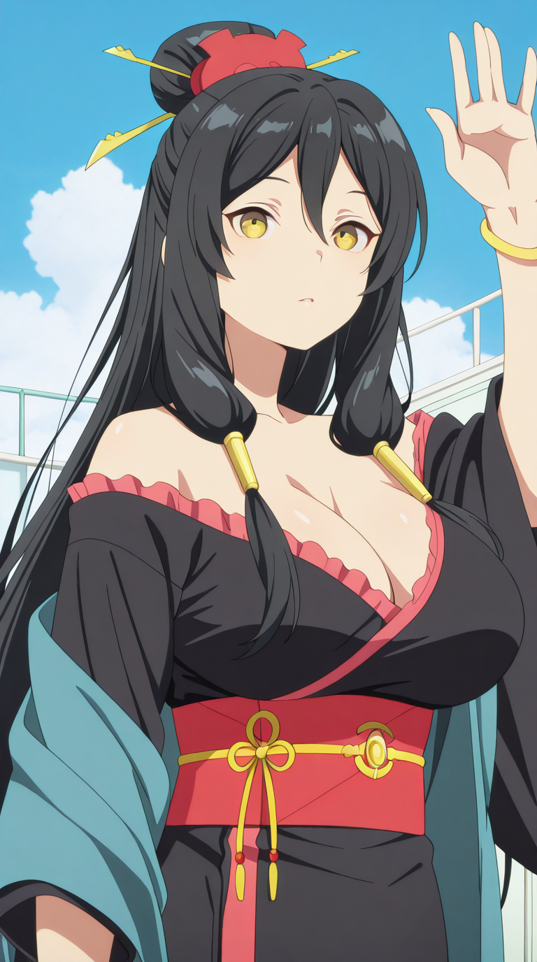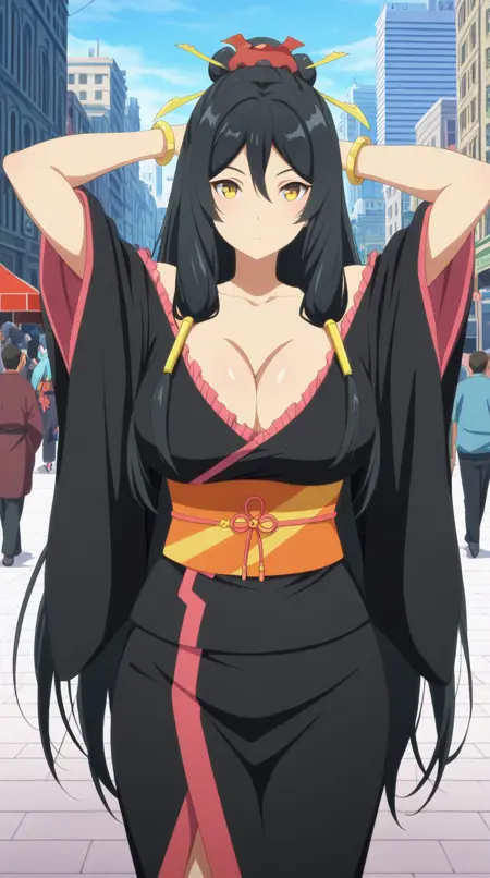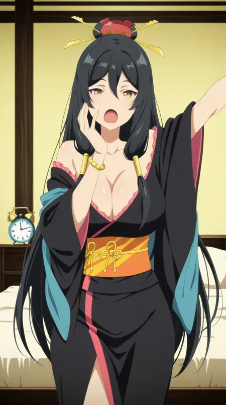 tio clarence,长发,黑发,发饰,头发遮住眼睛,极长发,黄眼,发簪,成熟女性,大乳房,动漫截图