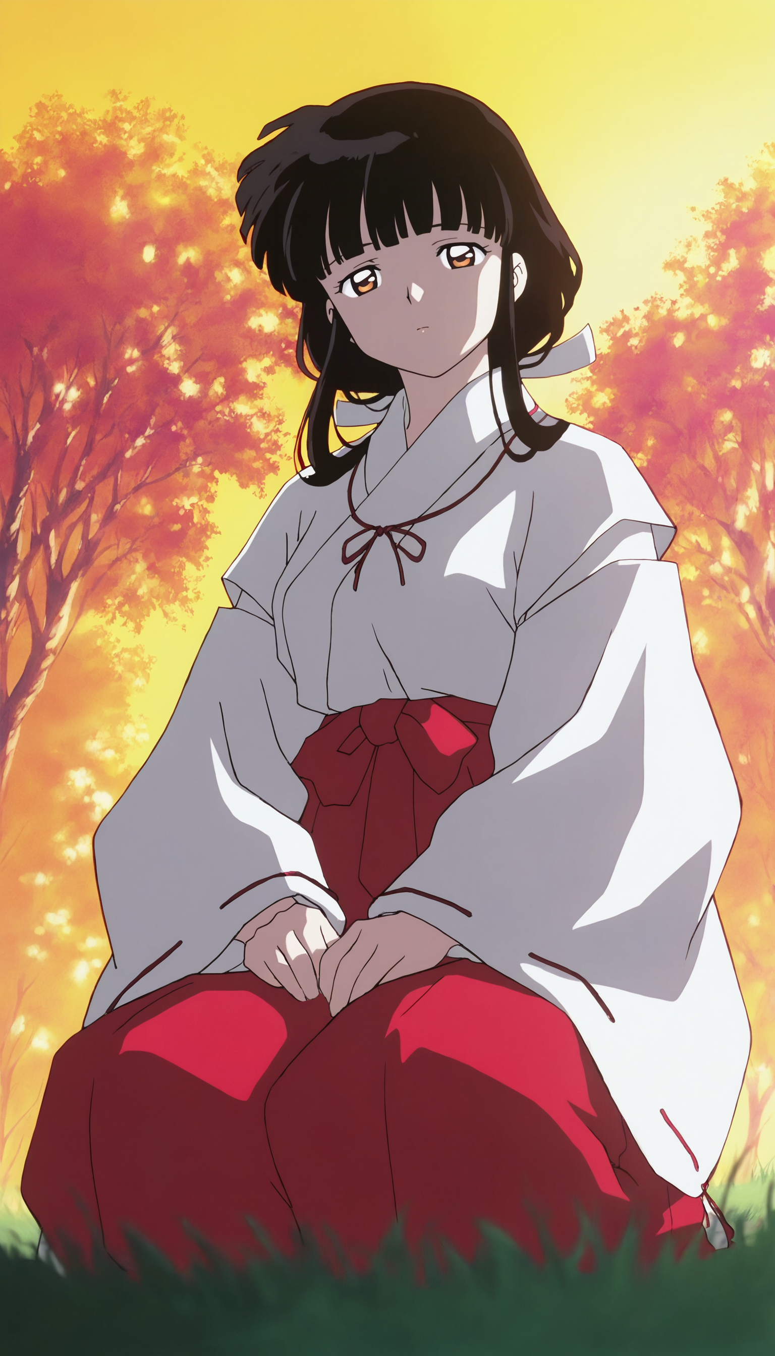 klky0, 검은 머리, 앞머리, 낮은 기사골, 흰색 스트런치, 갈색 눈, 미코 옷차림, 빨간 리본 목걸이, 빨간 하카마, 흰색 타비, 짚 신발,