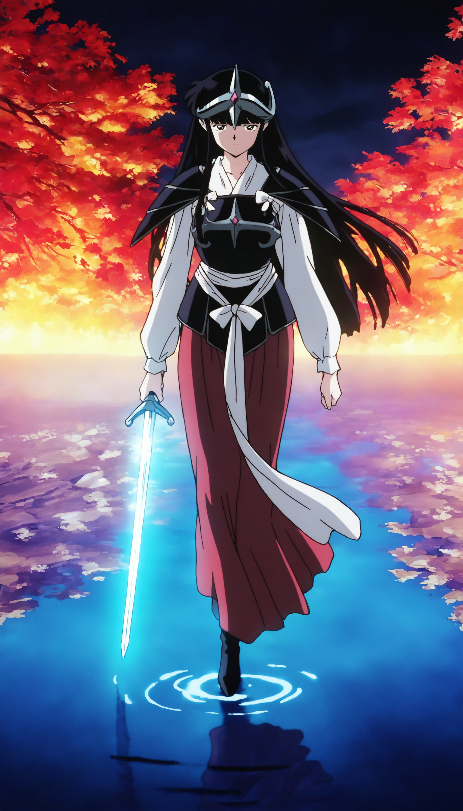 klky0, 검은 머리, 앞머리, 긴 머리, 갈색 눈, 관찰자 바라보기, 머리장식, 흰 로브, 소매, 어깨 갑옷, 가슴 갑옷, 흰 허리 리본, 빨간 긴 치마, 검은 부츠,