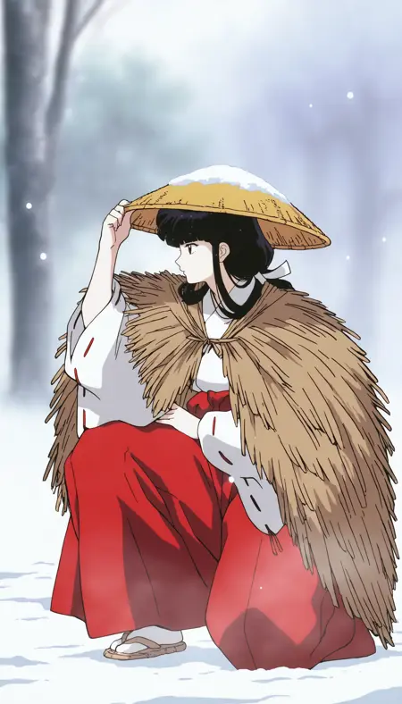 klky0, 검은 머리, 앞머리, 낮은 기사골, 흰색 스트런치, 짚 모자, 미코 옷차림, 짚 망토, 빨간 하카마, 흰색 타비, 짚 신발,