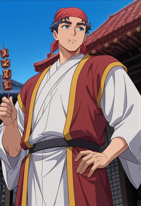 white cape,vambraces,dou,sode,red kimono,kusazuri,