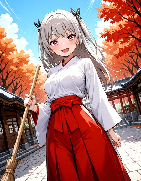 Maiten_qcode, long hair, grey hair, red eyes, two side up, butterfly hair ornament, breasts