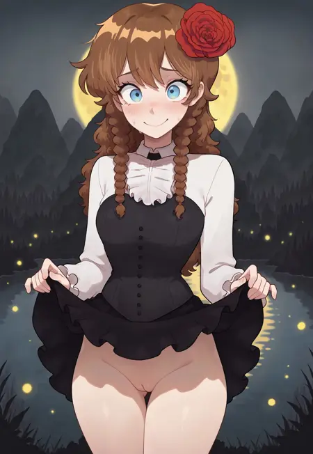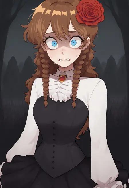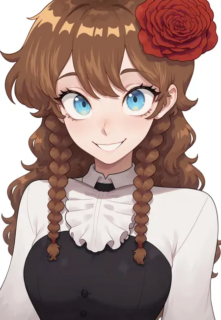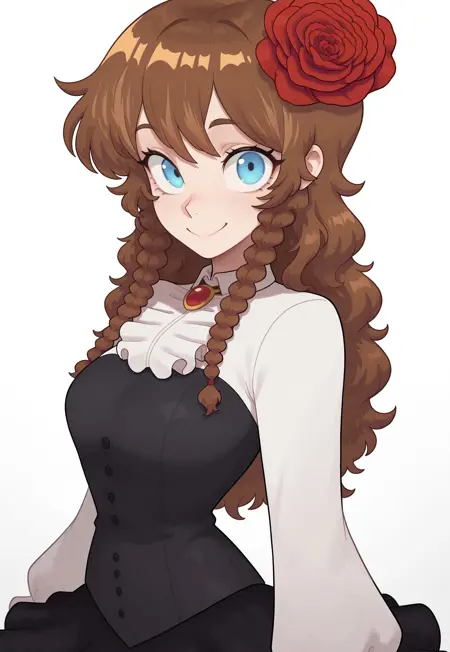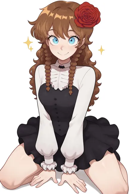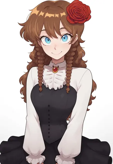 hair flower, rose, hair ornament, long sleeves, black and white dress, buttons, ascot, white shirt, skirt, black skirt,