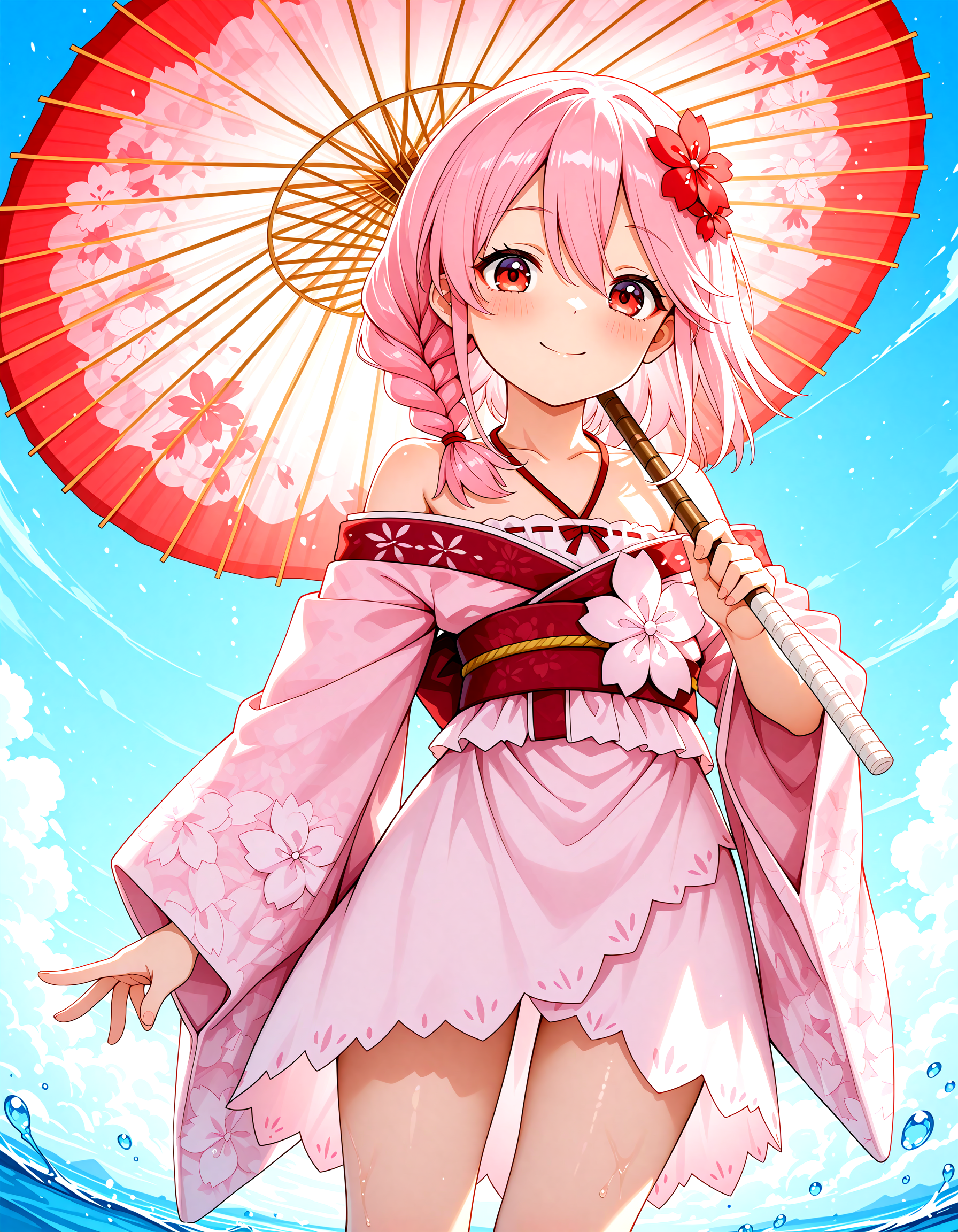 xuan_ying_10, pink hair, single braid, hair flower, long hair, red eyes, hair between eyes