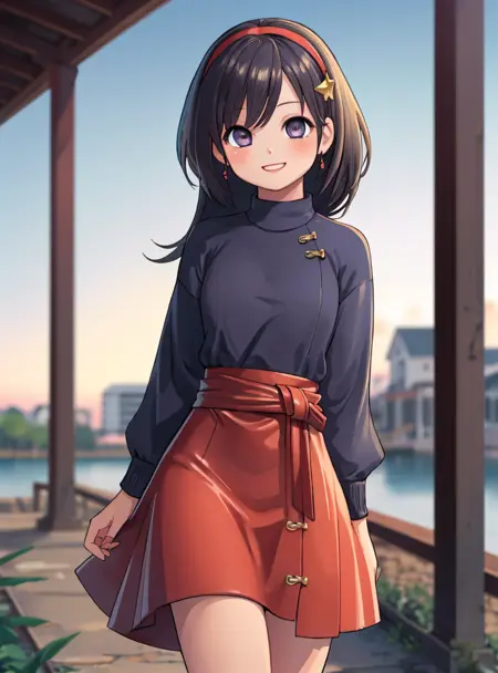 one woman, evening, purple n white dress, river, purple lily, smiling