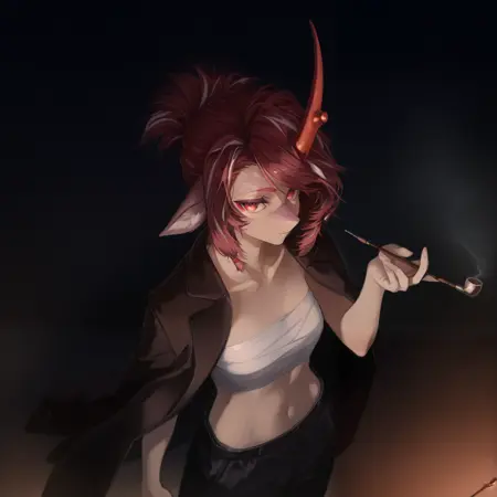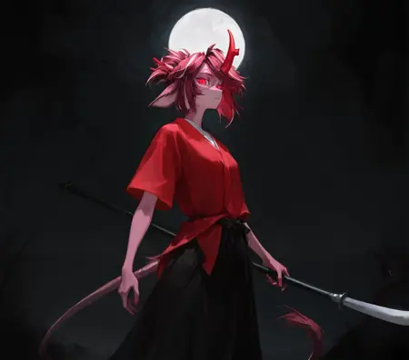 Fumizuki, single horn, two-color hair, short hair, red eyes, animal ears, tail