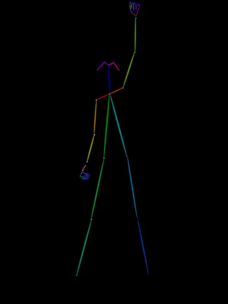 使用OpenPose骨骼图像和线稿,描绘一位女性(也可能为男性,但在生成骨骼时使用了女性模型)将拳头高举向空中的姿态。