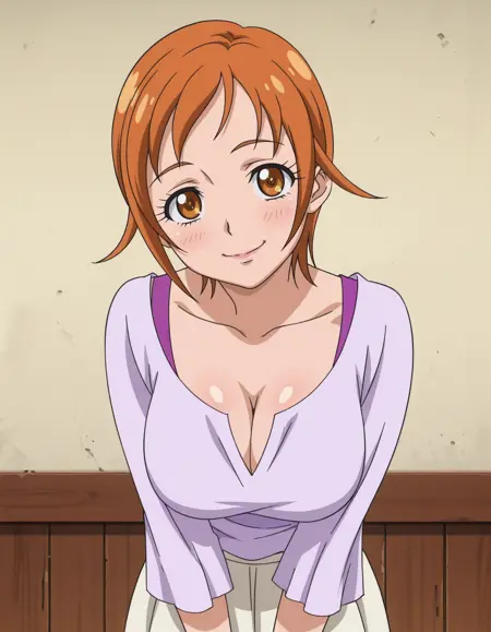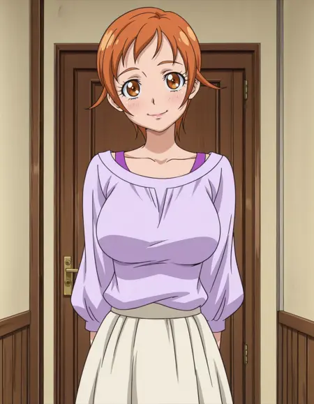 애니메이션 화면 캡처, 싱글, 1소녀, aidaayumi, 입술, 보라색 셔츠, 치마, lora:aidaayumi_IL:0.8, 고해상도, 놀라운 품질, 최고 품질, 매우 아름다운, 명작, absurdres,