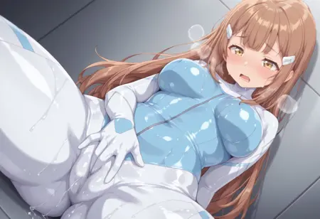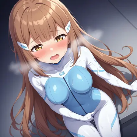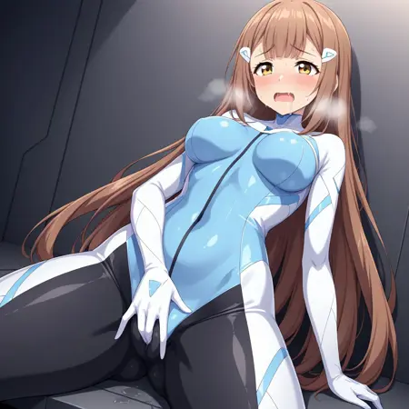 1girl, solo, long hair, breasts, brown hair, hair ornament, bodysuit, hairclip, bangs, blush, thigh gap, yellow eyes, skin tight, medium breasts, very long hair, brown eyes, gloves, large breasts