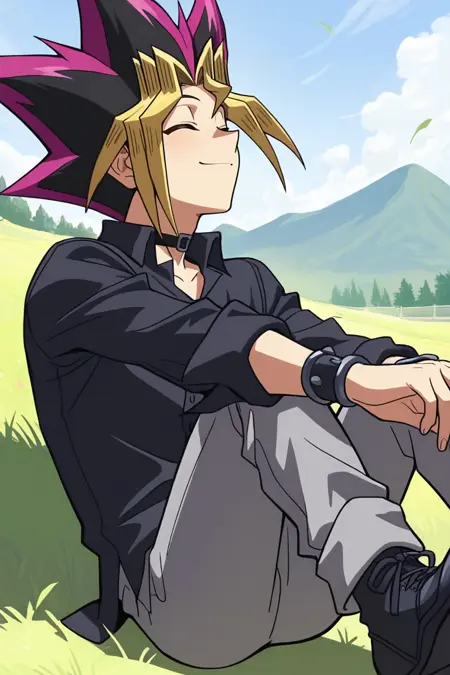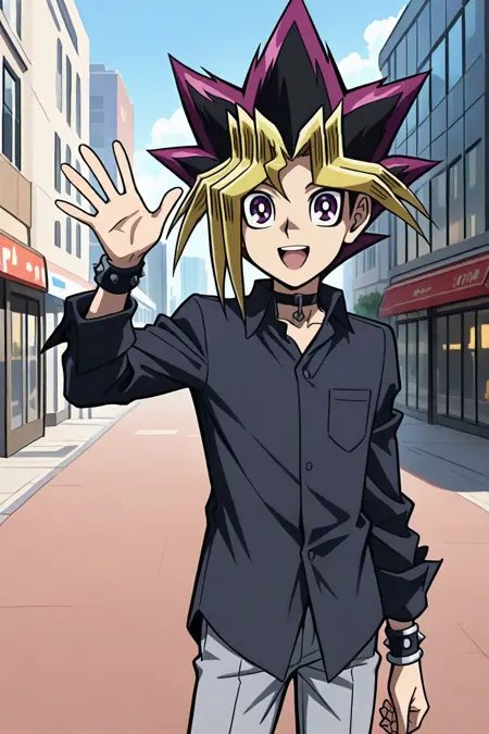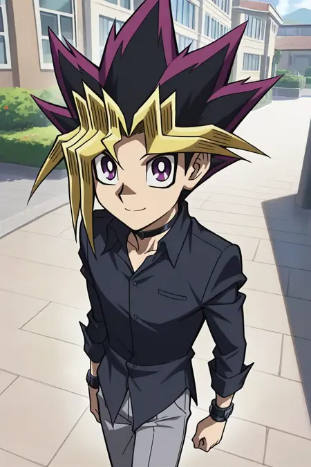 yugibsdsod,1boy, three-toned hair, spiked hair, purple eyes, black neck choker, black shirt, long sleeves, black wristbands, mountain mist grey pants, black shoes, solo,