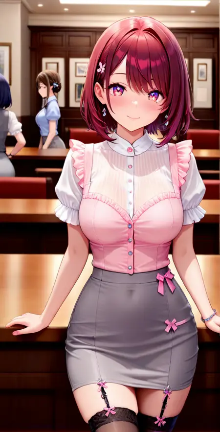 Prompt word: cute_office_lady, short sleeves, frills, shirt, thighhighs, pencil skirt, garter straps, grey skirt, puffy sleeves, frilled sleeves