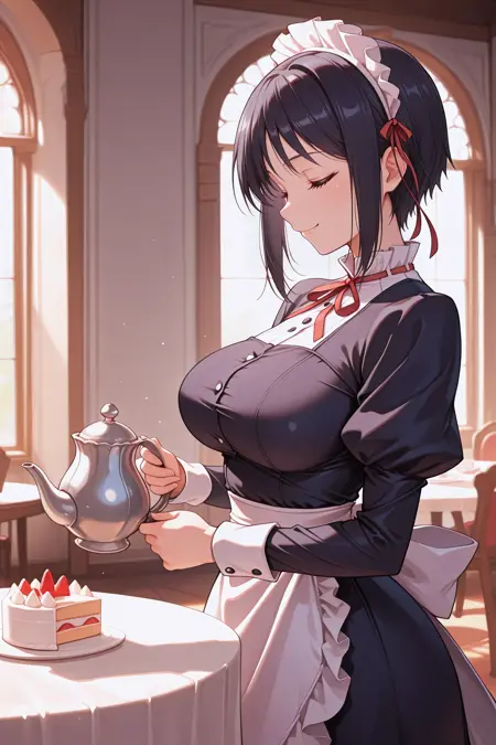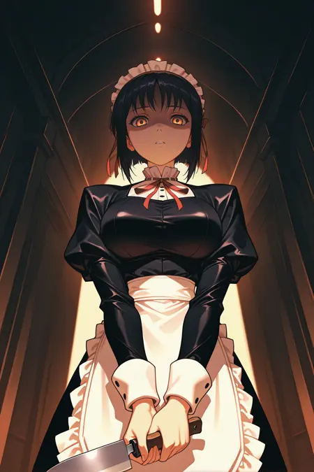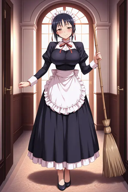 메이드 유니폼을 원할 경우 "메이드 헤드기어, 검은 드레스, 줄리엣 소매, 목 리본, 빨간 리본, 흰 앞치마, 허리 앞치마, 긴 드레스"를 추가하세요.