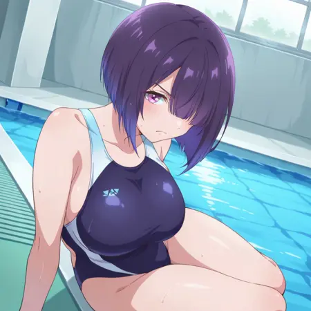 キャラクターsumiyoshiizumi, 1girl, short hair, big breasts, asymmetrical bob, side bangs, long bangs covering one eye, bangs over eye, dark violet hair, blue hair tips, gradient hair, purple eyes, dark blue swimsuit, one-piece swimsuit, competition swimsuit, light blue shoulder straps, swimsuit outfit, close angle, one quarter shot, front angle, face focus, pov, inside, room,sumiyoshiizumi, 1girl, short hair, big breasts, asymmetrical bob, side bangs, long bangs covering one eye, bangs over eye, dark violet hair, blue hair tips, gradient hair, purple eyes, dark blue swimsuit, one-piece swimsuit, competition swimsuit, light blue shoulder straps, glasses, hair clip, triangle hair clip, long sleeve shirt, white turtleneck shirt, high collar, layered outfit, sleeveless dress, navy blue dress, dark blue jumper dress, modest outfitsumiyoshiizumi