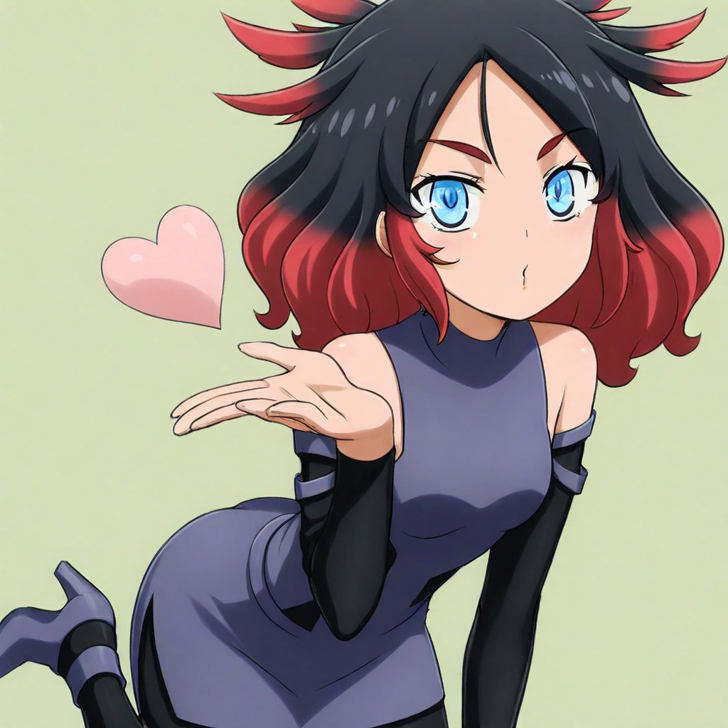 mitsuko hiramori \(ygo\), multicolored hair, black hair, red hair, hair tied up, medium hair, blue eyes, dress, skirt, detached sleeves, pants, heels, large breasts, 1girl, solo