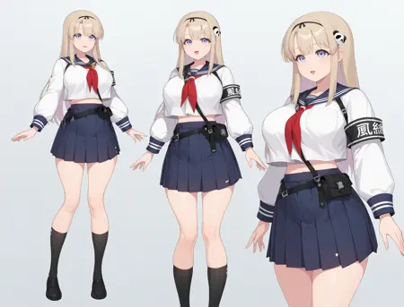 Haru,Chaos_Zero_Nightmare, panda acessory, long hair, gloves, 1girl, sailor collar, neckerchief, big breasts, bangs, blue skirt, pleated skirt,blue eyes,navy school outfit ,blonde hair, black socks, black school shoes, blue eyes