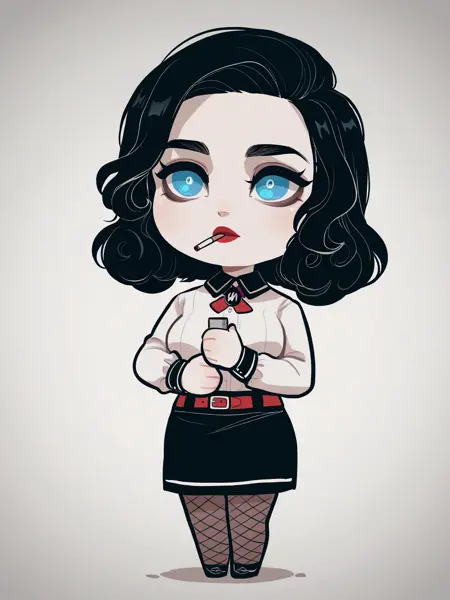 bsburialbeth, white shirt, neck ribbon, long sleeves, belt, black skirt, fishnet pantyhose, red lips, black hair, blue eyes, wavy hair