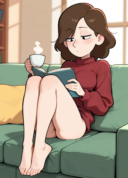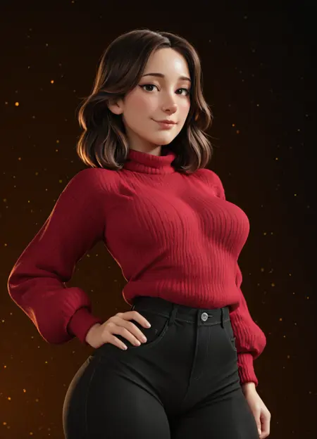 Johanna112, brown hair, red sweater, long sleeves, medium breasts, black eyes, medium hair
