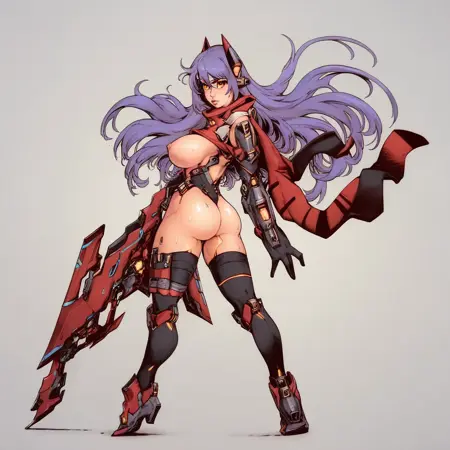 (Xenoblade_Poppi, 长发, 紫发, 橙色眼睛, 机器人, 高腿紧身衣, 机器人耳朵, 机器人关节, 围巾, 手套, 过膝袜, 武器)
