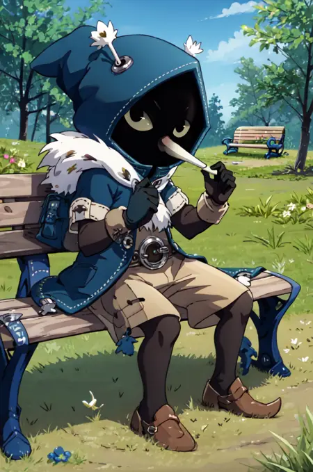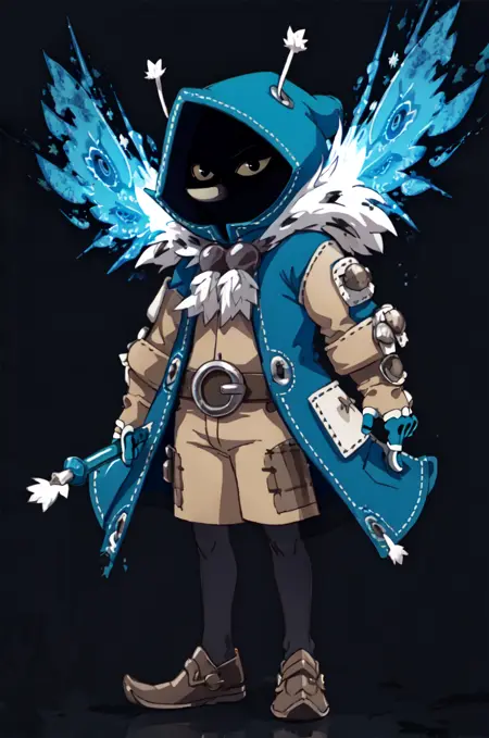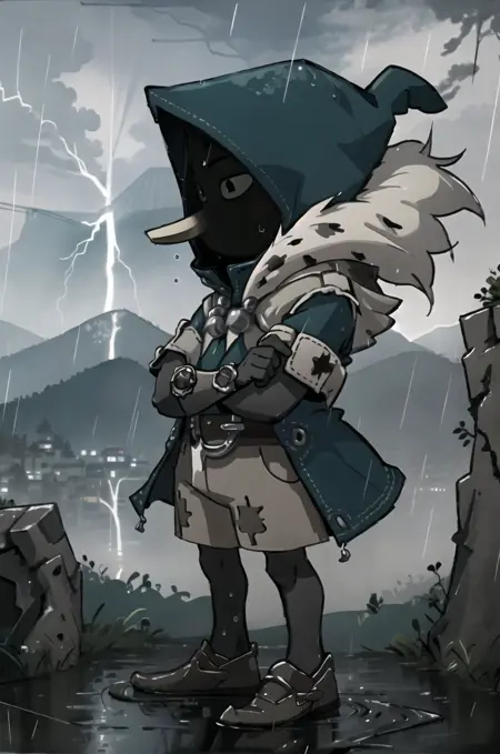 Prompts are : joris, 1boy, solo, faceless, (long nose:1.2), colored sclera, black eyes, hood, jorisoutfit, fur trim, full body, thin legs,