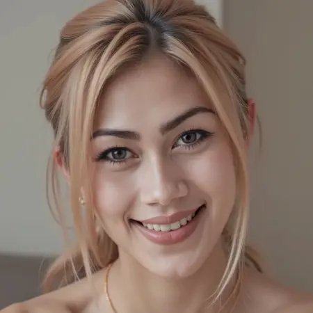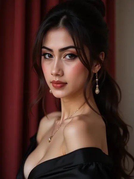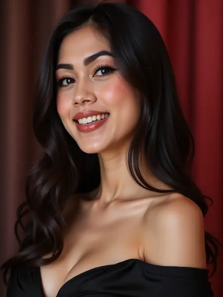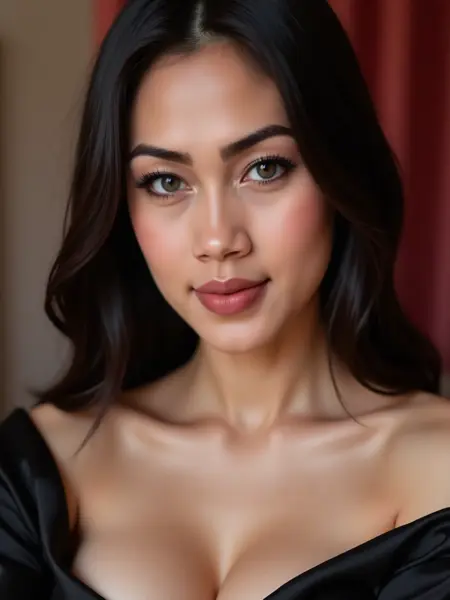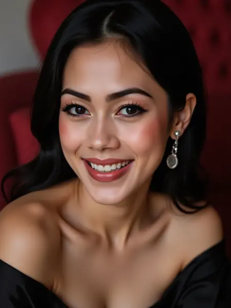 超精细的近景侧脸肖像,描绘一位美丽的印尼女性,肌肤光滑无瑕,肤色白皙,长发乌黑。她拥有引人注目的亮蓝灰色眼睛,被浓密纤长的睫毛和完美塑造的眉毛环绕,嘴角自信地微张,露出牙齿。她的双唇丰润柔软,涂着哑光玫瑰色口红。光线柔和均匀,突出她清晰的肤色与面部对称性。她身着黑色绸缎服装,略微露肩的领口增添优雅与微妙魅力。丰满的胸部与完美的曲线轮廓清晰可见。背景柔和虚化,隐约透出红色调,形成与面部的对比,聚焦视线。整体风格为超写实,兼具美妆摄影美学、高清晰度、细腻肌肤纹理、电影级景深、自然神态与时尚杂志风格。