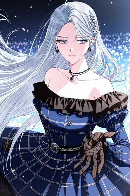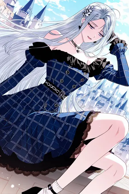 주벨리안_아우트핏3, 파란색 체크 무늬 드레스, 어깨 드레스, 스트랩리스 드레스, 어깨 노출, 데리골드, 어깨 드레스 네크라인, 주름진 네크라인, 검은 주름, 장식용 단추, 긴 소매, 검은 장갑, 레이스 장갑, 검은 벨트, 보석 버클, 은색 트림 벨트, 검은 언더스커트, 긴 언더스커트, 레이스 트림, 레이스 헴 언더스커트, 흰색 양말, 검은 힐, 초커 목걸이, 검은 목걸이, 검은 보석 목걸이, 하트 목걸이, 허리 체인, 은색 체인,