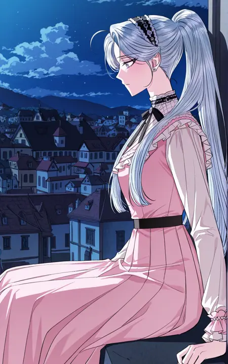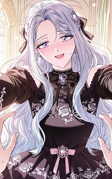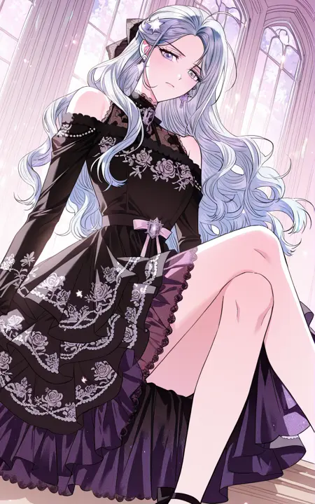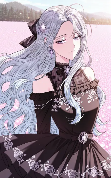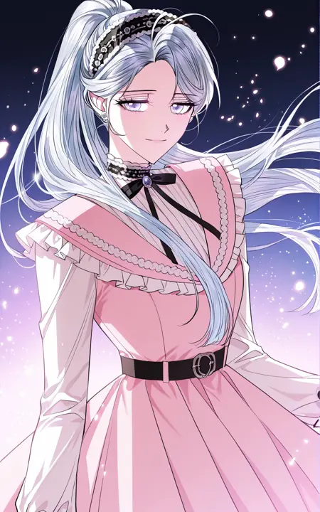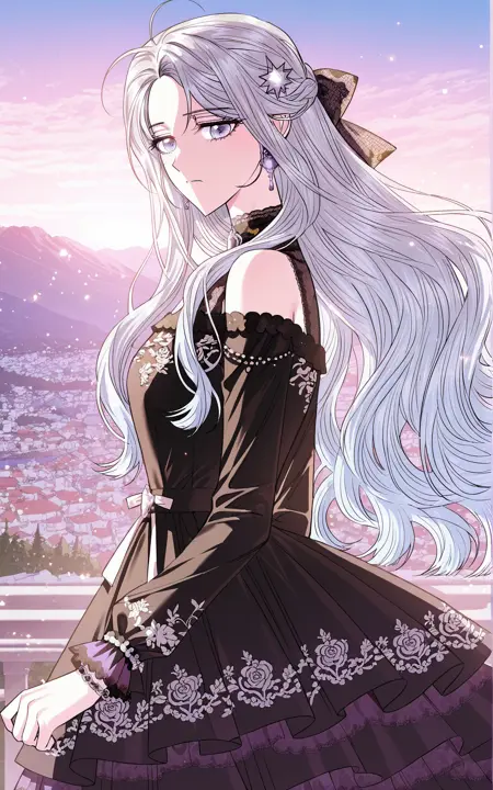 주벨리안, 1소녀, 단독, 그라데이션 눈, 보라색 눈, 연한 파란색 눈, 긴 머리, 은색 머리, 갈라진 앞머리, 물결치는 머리, 한쪽을 땋은 반올림 헤어스타일, 헤어 리본, 검은 헤어 리본, 레이스 헤어 리본, 분홍색 헤어 장식, 별 헤어 장식, 분홍색 귀걸이, 십자형 귀걸이,