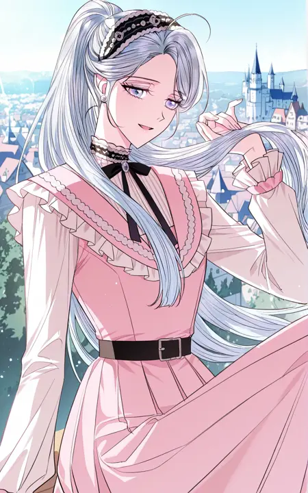 주벨리안_아우트핏2, 흰색 내부 블라우스, 주름진 블라우스, 높은 칼라, 레이스 초커, 검은 목 리본, 분홍색 드레스, 레이스 트림, 주름진 드레스 칼라, 긴 소매, 주름진 소매 끝, 검은 벨트, 긴 스커트