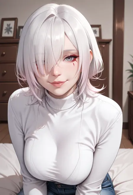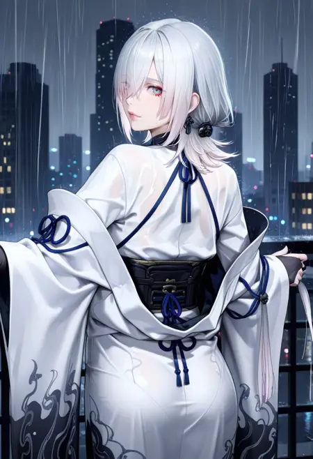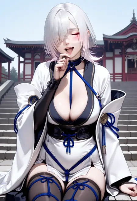 "SE0RNG4, white hair, medium hair,hair over one eye, gray eyes, gradient hair, lips, facial mark, white kimono, shibari, o-ring, cleavage, rope between breasts, large belt,hip vent, wide sleeves, white thighhighs"