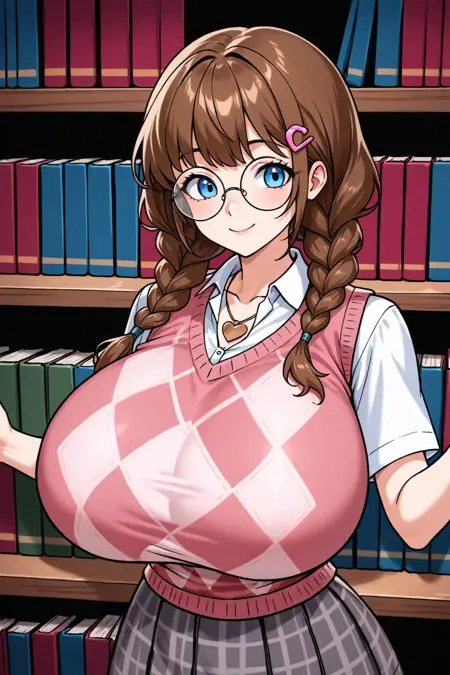 argyle sweater vest, pink sweater, plaid skirt, grey skirt, white shirt, collared shirt, short sleeves, heart necklace, hair ornament