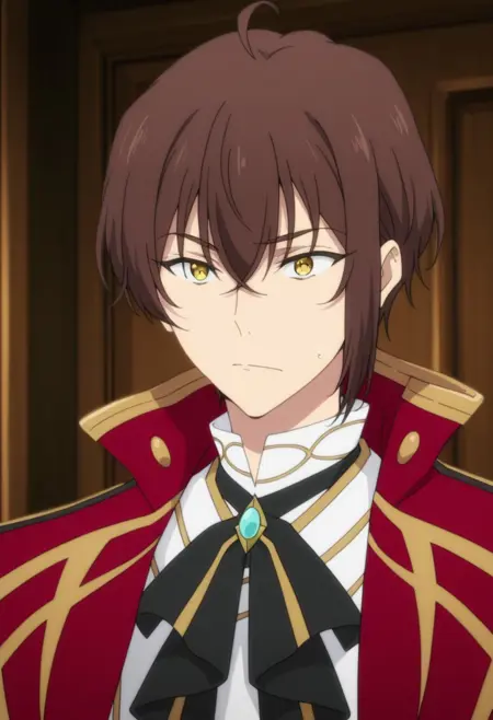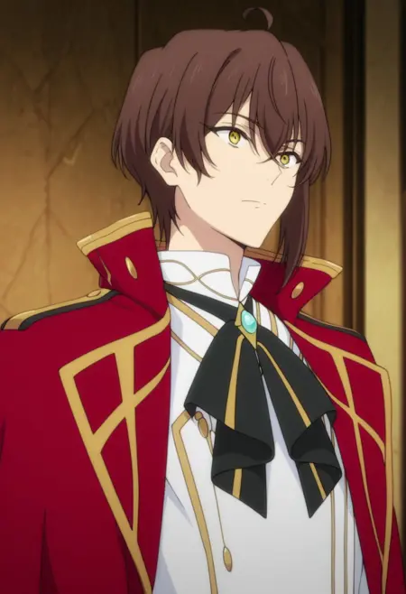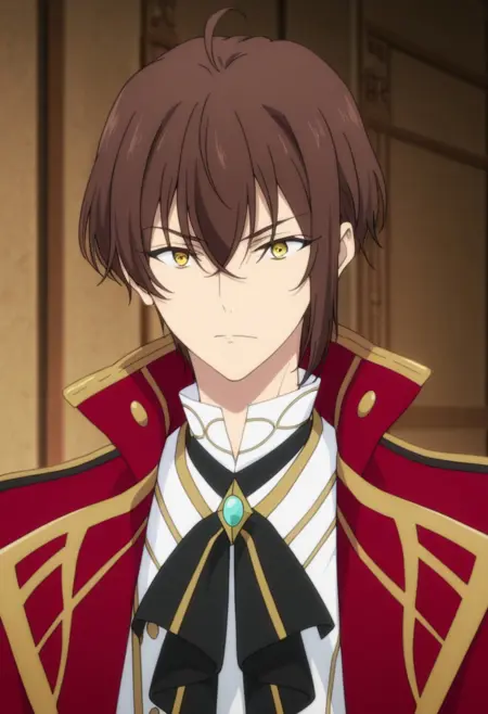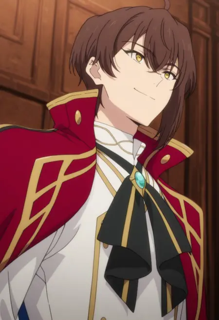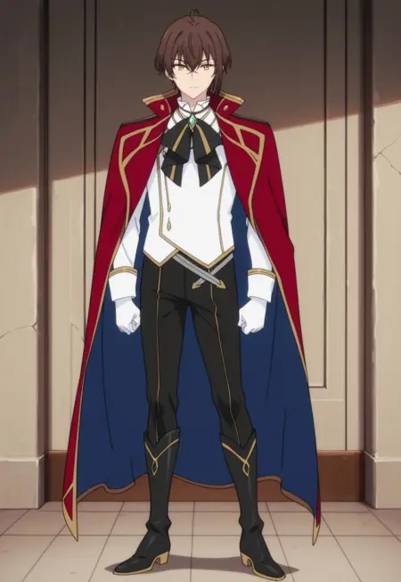 1boy, male focus, solo, yellow eyes, brown hair, white shirt, black bow, brooch, red cape, white gloves, black pants, boots, black footwear,