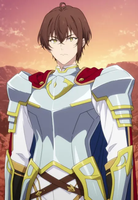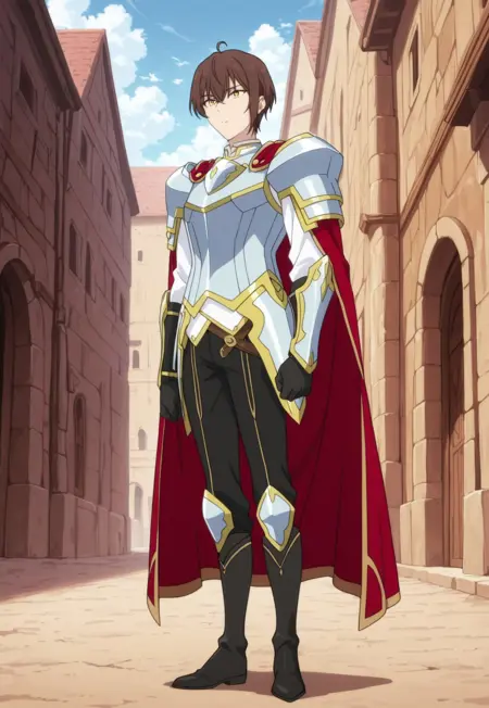 1boy, male focus, solo, yellow eyes, brown hair, white shirt, white armor, shoulder armor, red cape, breastplate, wrist guards, black gloves, black pants, boots, black footwear,