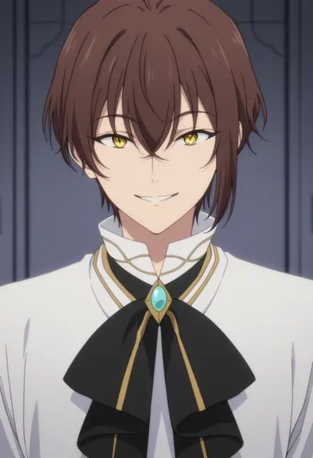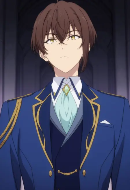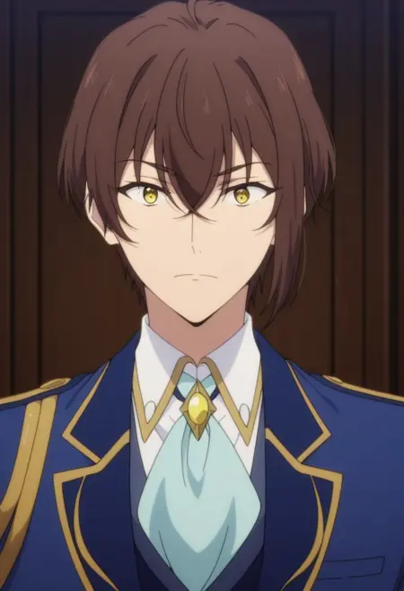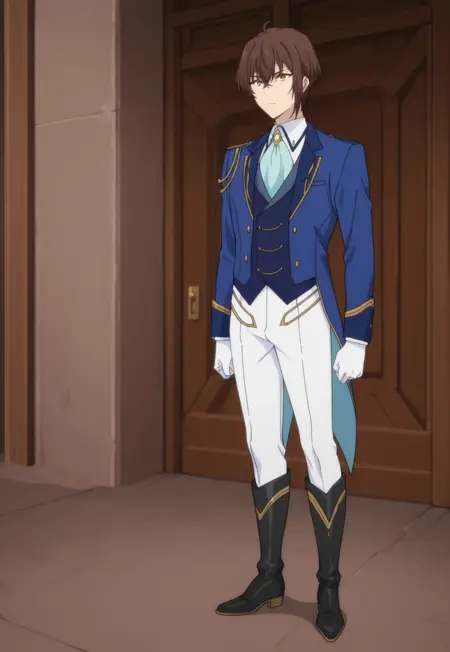 1boy, male focus, solo, yellow eyes, brown hair, white shirt, blue ascot, brooch, blue jacket, blue vest, white gloves, tailcoat, white pants, boots, black footwear,