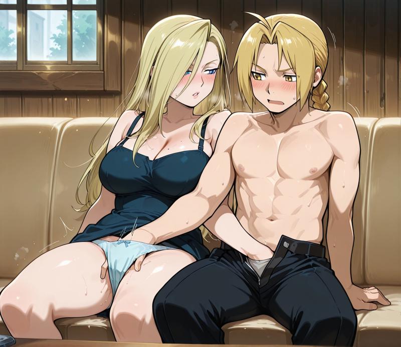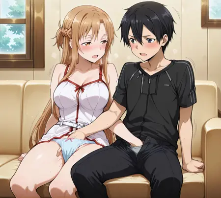 1个女孩,脸红,乳房,1个男孩,坐着,乳头,出汗,阴茎,阴户,看着对方,沙发,坐在沙发上,