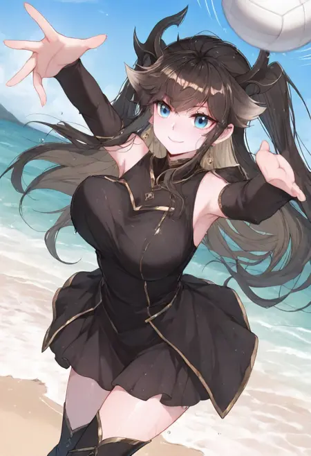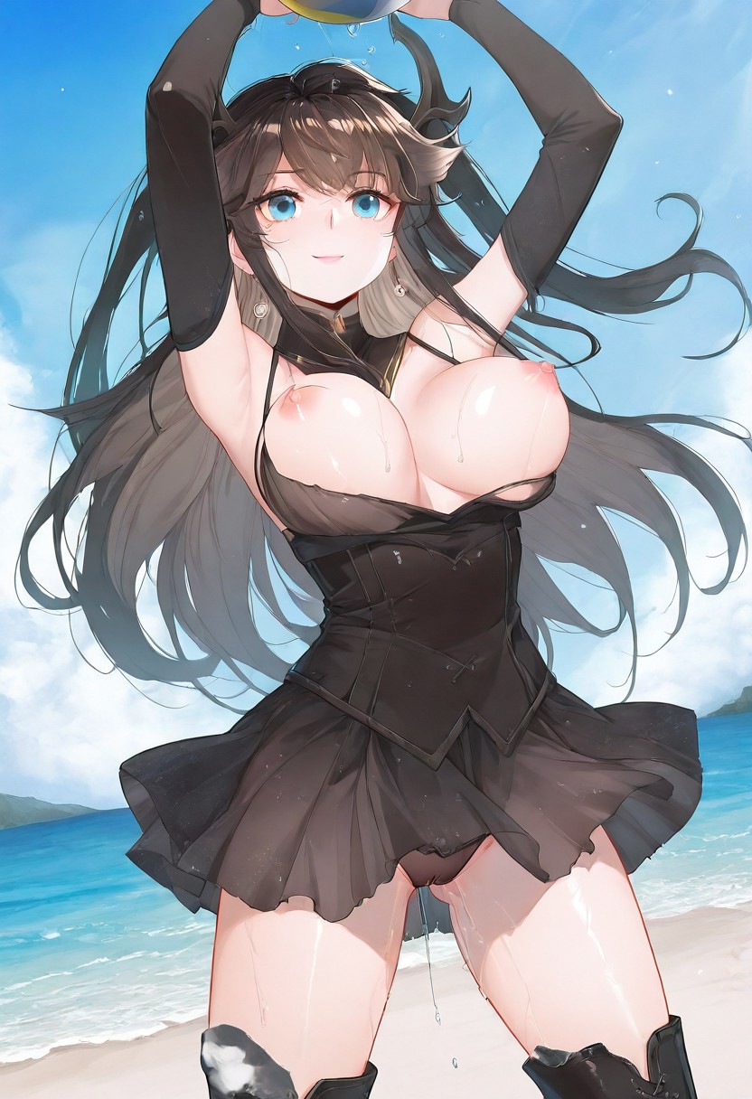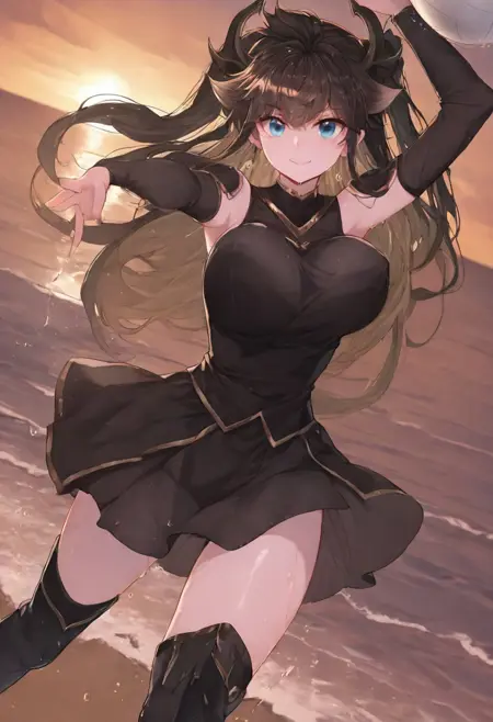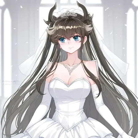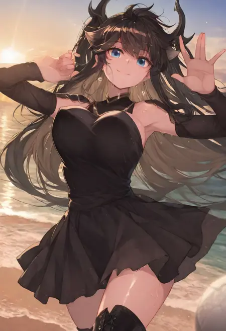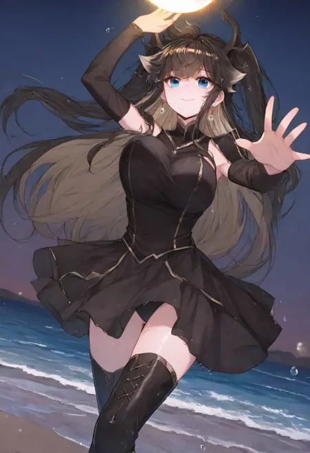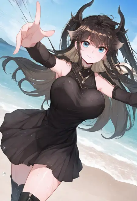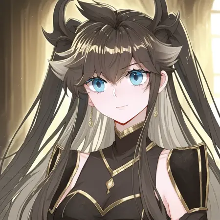 트리거어: GDPrincess, 검은 머리, 긴 머리, 드래곤 뿔, 파란 눈, 귀걸이, 양측 올렸음, 드래곤 뿔,