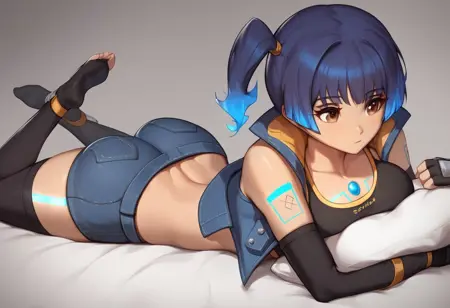 (Xenoblade_Sena, short hair, side ponytail, blue hair, brown eyes, chest jewel, jacket, sports bra, crop top, shoulder, strap, shorts, thighhighs, fingerless gloves),