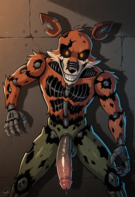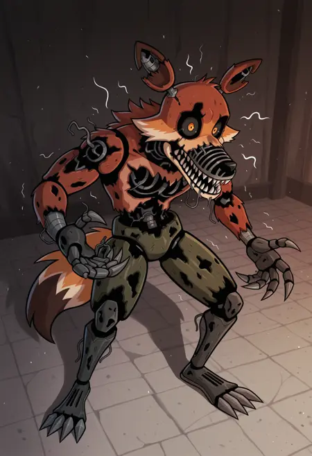 n1ghtm4r3f0xy, animatronic (fox), damaged, black sclera, orange eyes,