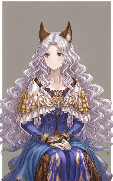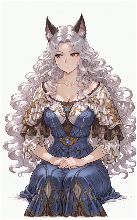 Mugain, silver hair, wavy hair, brown cat ears, brown eyes,