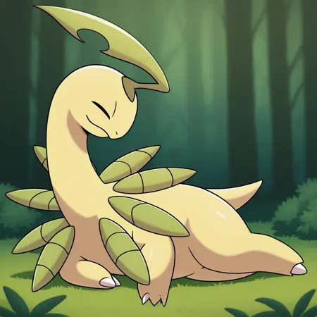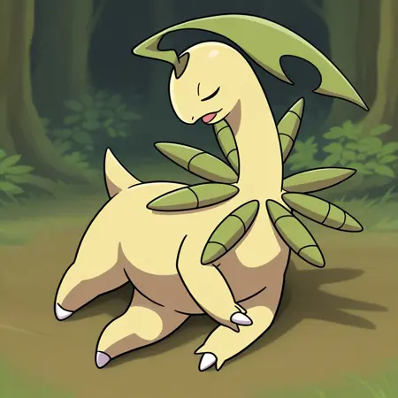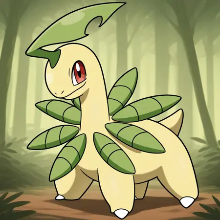 pokemon (creature), sauropod, dinosaur, yellow skin, red eyes, leaf on forehead, round snout, neck leaves, stubby tail,