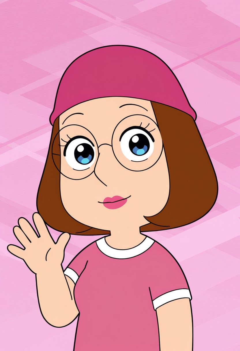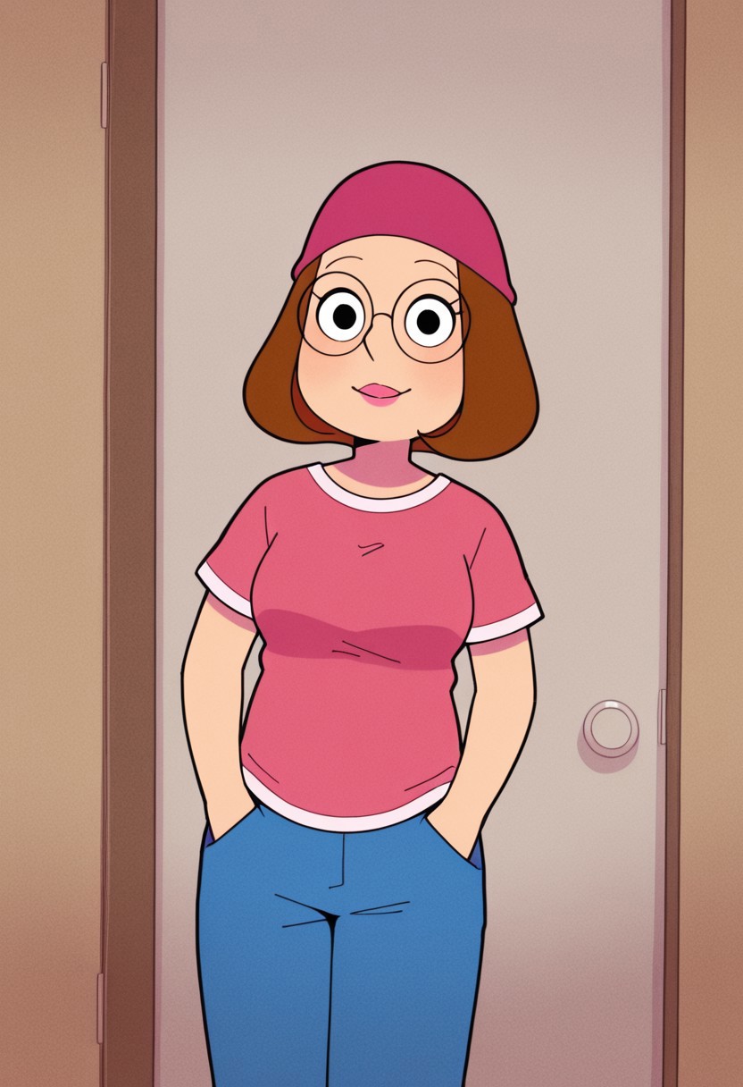 梅格,1名女性,女性,棕色头发,粉红色帽子,圆形眼镜,黑色眼睛,粉红色口红,白色T恤,蓝色裤子,白色运动鞋,