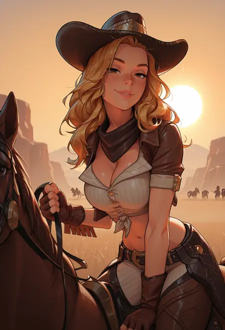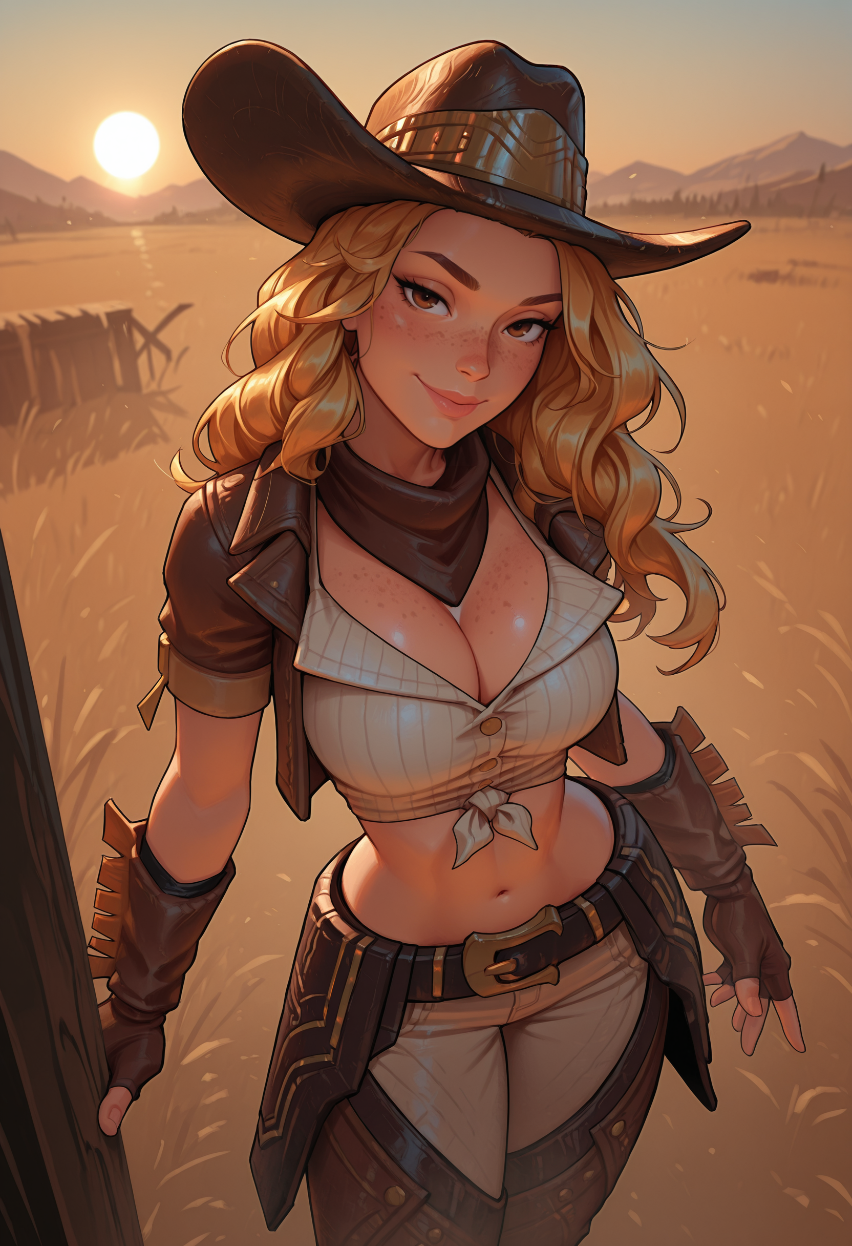 cgmfil, large breasts, long hair, brown eyes, blonde hair, lips, freckles, navel, pants, belt, midriff, fingerless gloves, crop top, brown gloves, cowboy hat, chaps, cowboy western, cowboy boots, belt buckle, tied shirt, holster, fringe trim, short sleeves, open jacket, cropped jacket,