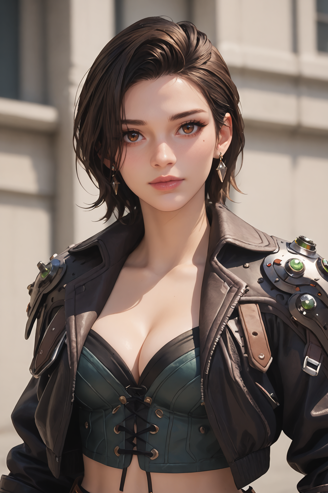 brown hair,short hair,brown eyes,earrings,mole under eye,